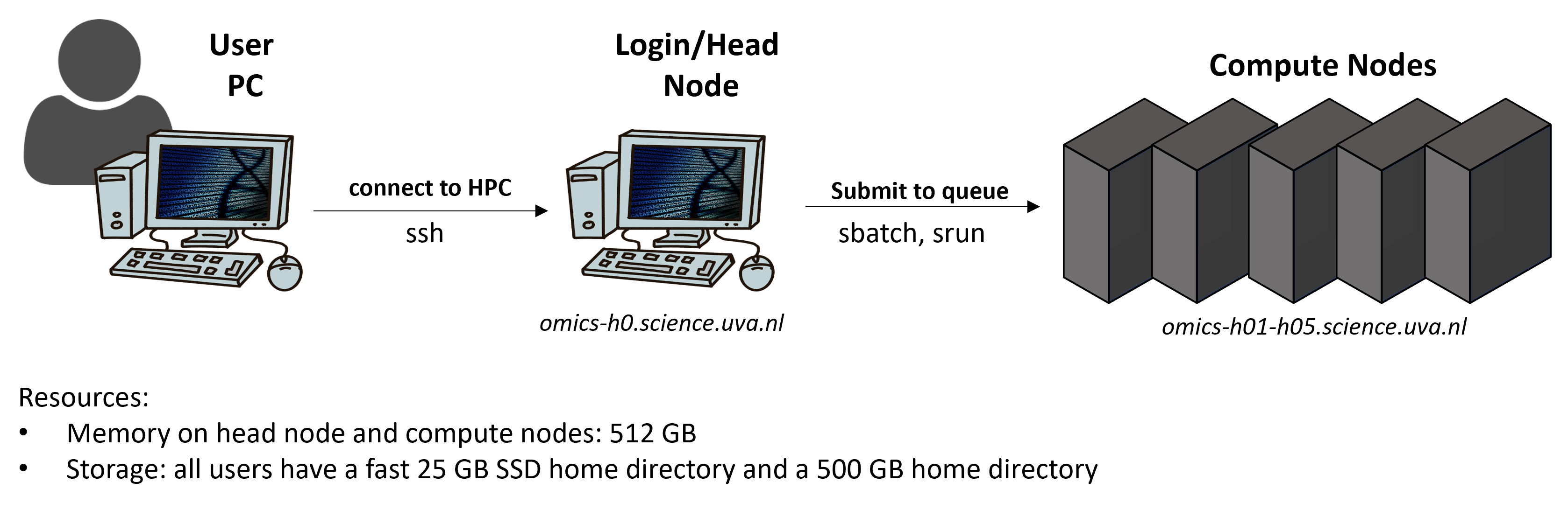 Using an HPC works a bit differently than running jobs on your computer, below you find a simplified schematic: